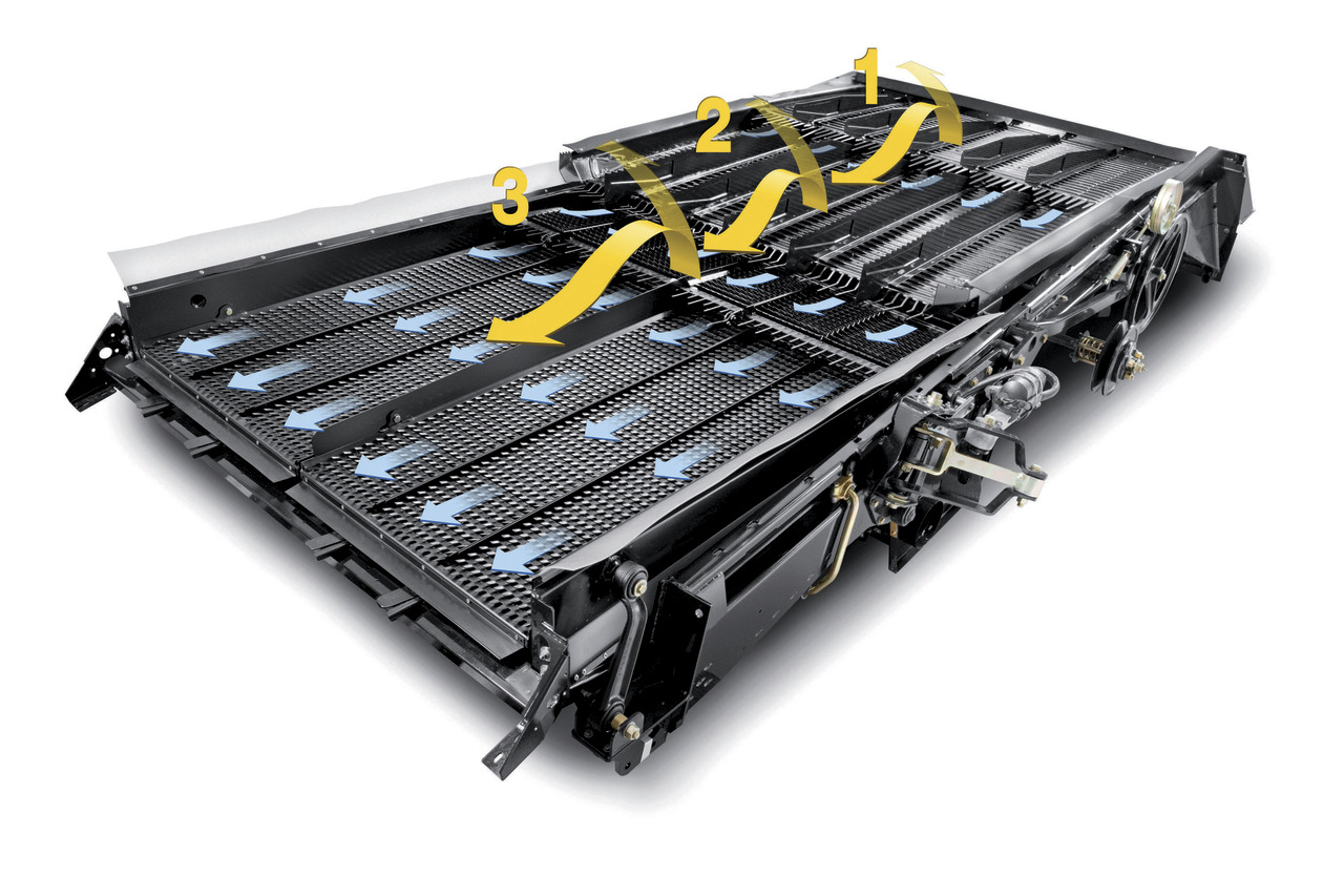 Düz arazide, elekler biçerdöver şasisiyle aynı doğrultuda hareket eder, eğimli arazide ise yanal hareket devreye girer, böylece kapasiteden ödün verilmez.